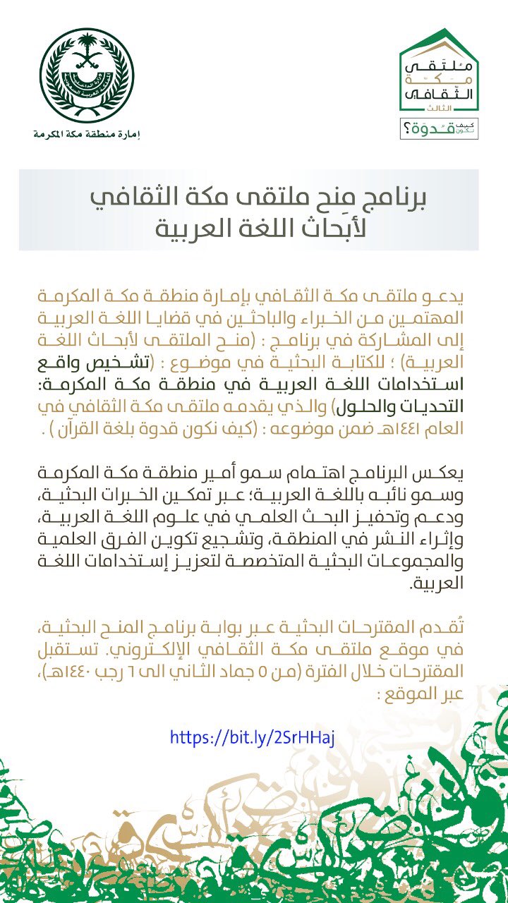 ملتقى مكة الثقافي Pa Twitter ملتقى مكة الثقافي يعلن عن بدء التقديم على برنامج م ن ح الملتقى لأبحاث اللغة العربية ضمن موضوع الملتقى للعام ١٤٤١هـ كيف نكون قدوة بلغة القرآن يمكن التقديم من خلال
