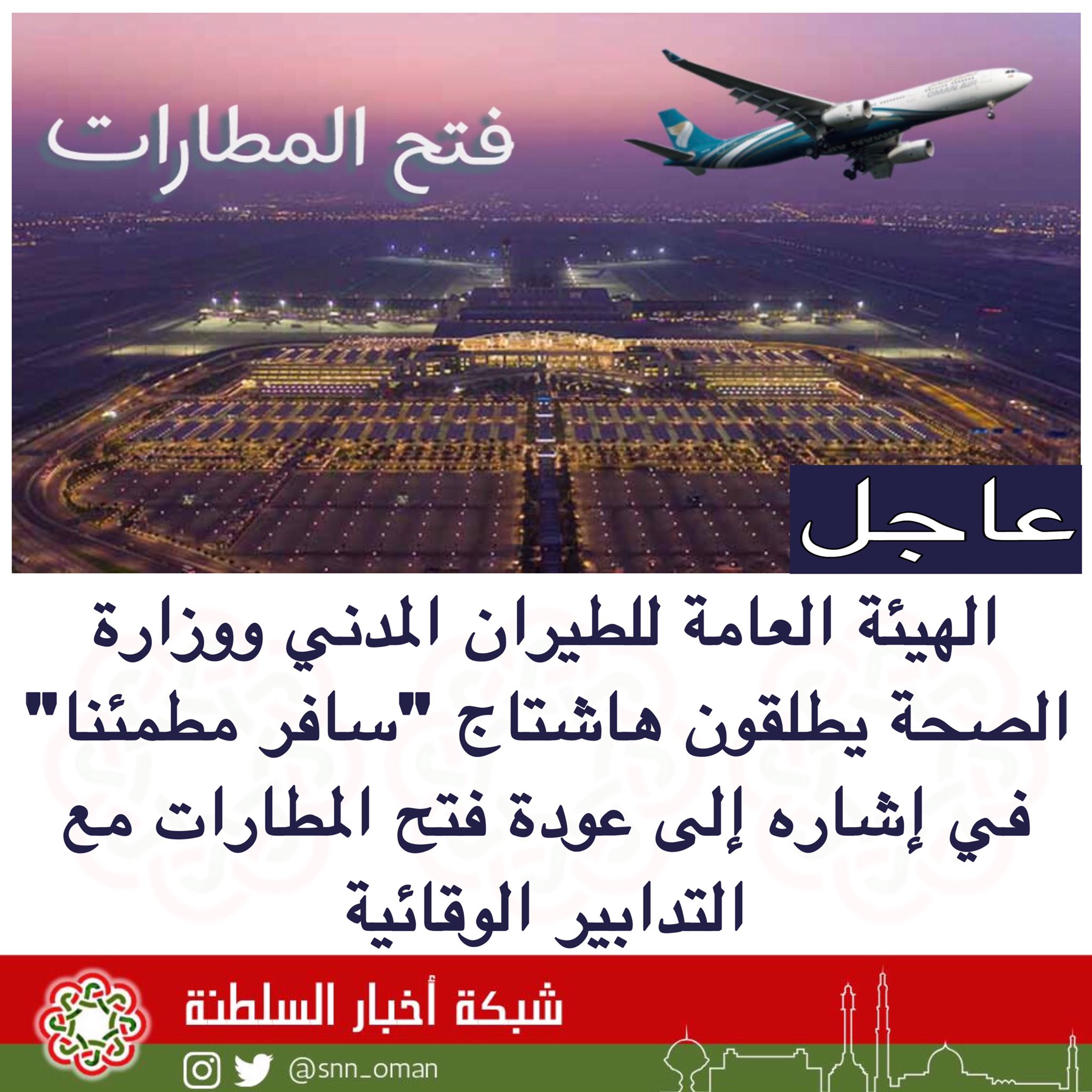 أخبار السلطنة Snn On Twitter عاجل الهيئة العامة للطيران المدني ووزارة الصحة يطلقون هاشتاج سافر مطمئنا في إشاره إلى عودة فتح المطارات مع التدابير الوقائية Https T Co Za5jvpfanf