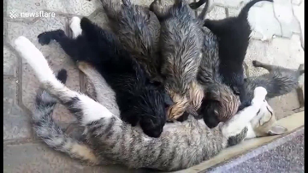 مشهد نادر الحدوث قطة ترضع 8 كلاب علامات أونلاين