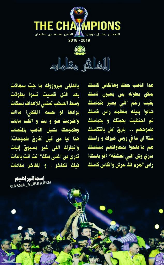 اسماالبراهيم On Twitter ألمفاخ ر مقامات الف الف الف مبروك لكل عالمي بطولة الدوري و ياجعله دووووووم النصر بطل دوري محمد بن سلمان النصر ابو نوران اسماالبراهيم هذا الذهب حقك وهالكاس كاسك يالعالمي مبروووك ما جت