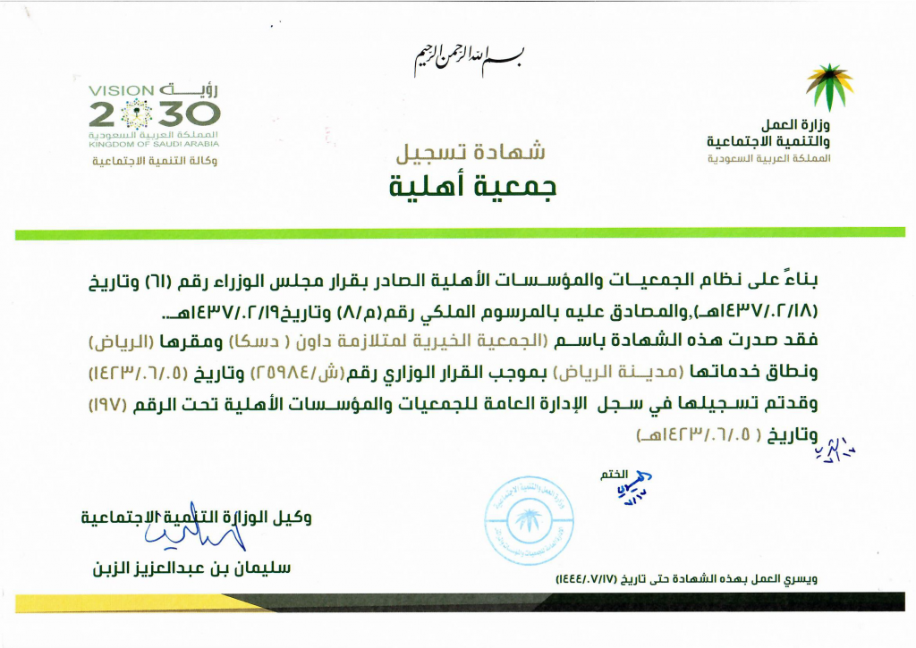 شهادة تسجيل جمعية دسكا
