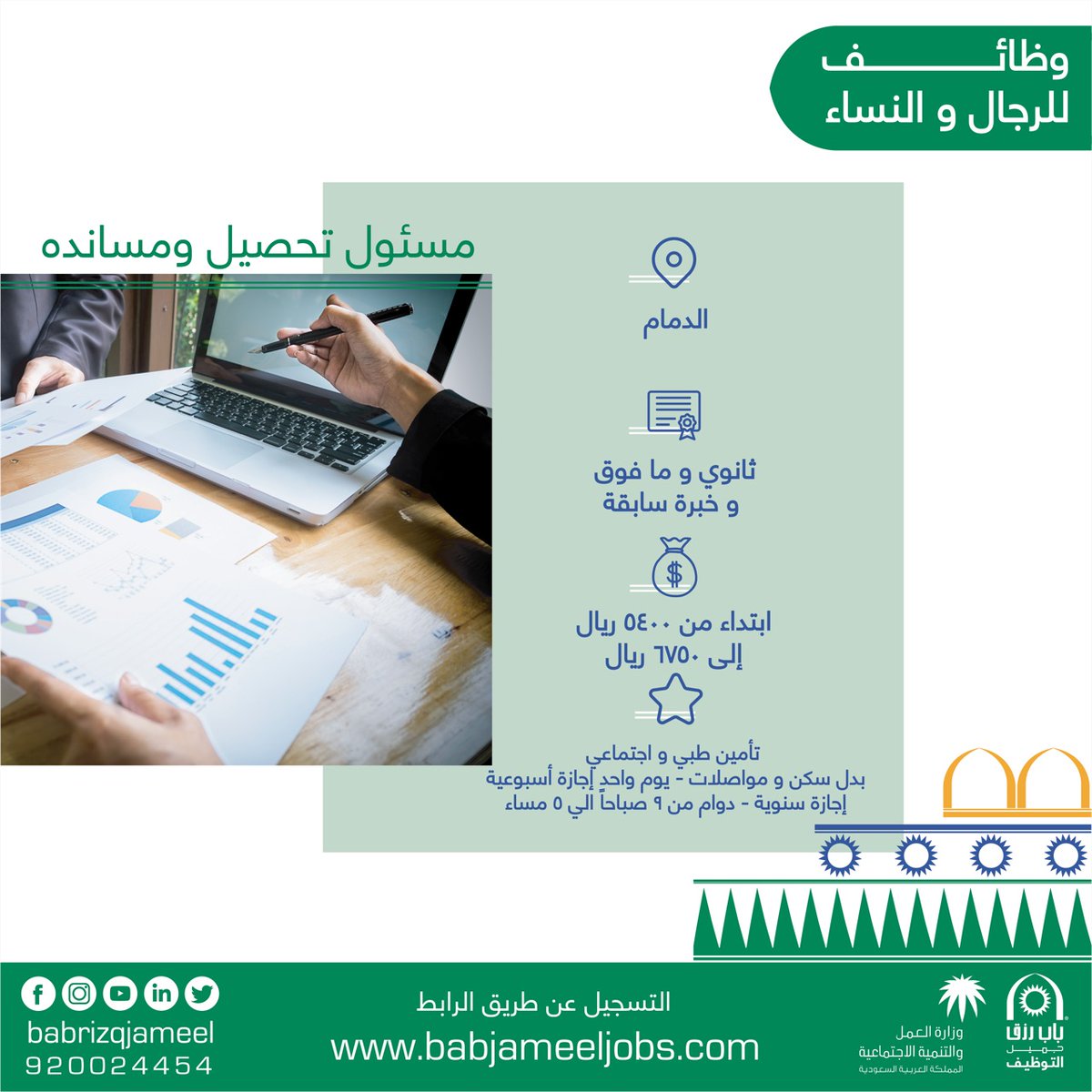 باب رزق جميل Bab Rizq Jameel On Twitter للرجال و النساء وظائف مسؤول تحصيل ومسانده المؤهلات ثانوية عامة فما فوق وخبرة سابقة الدمام الراتب ابتداء من ٥٤٠٠ إلى ٦٧٥٠ ريال سعودي