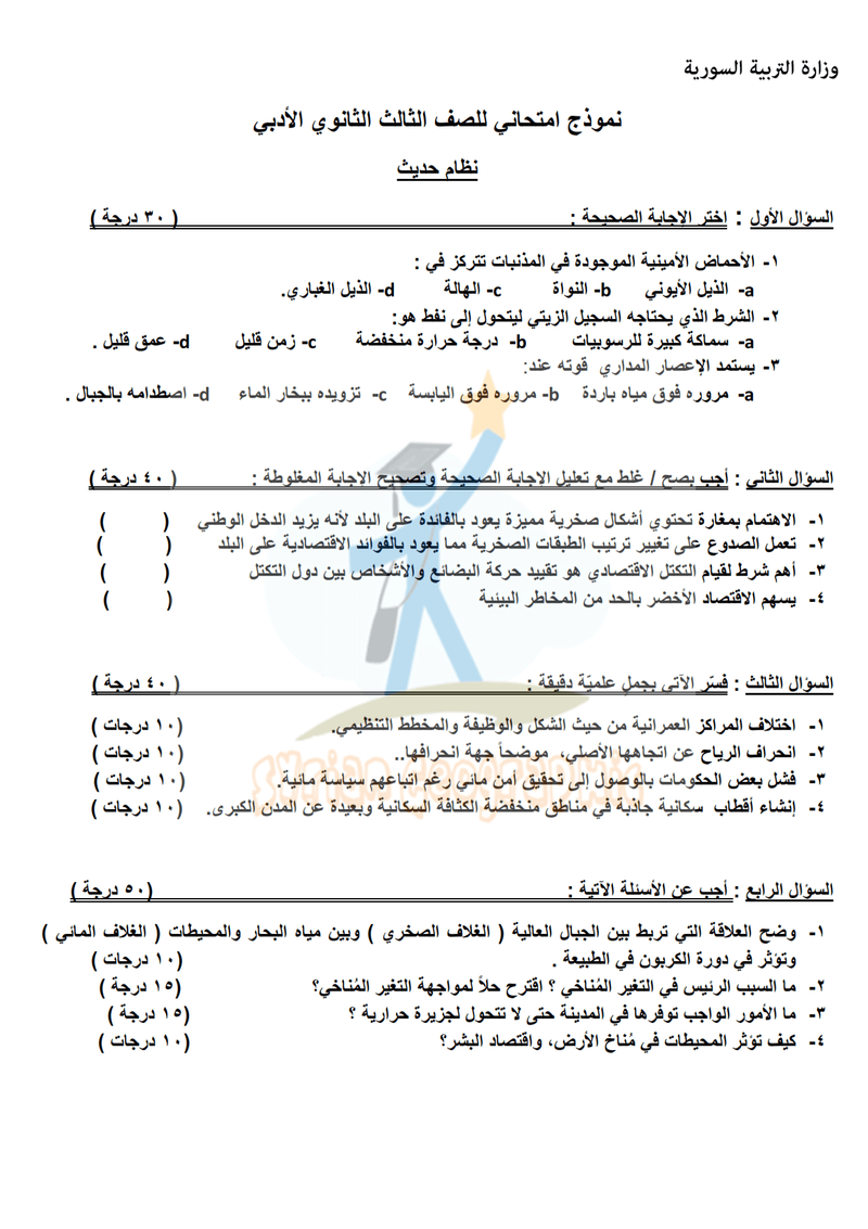نموذج امتحان مادة الجغرافية الصف الثالث الثانوي الأدبي 2020