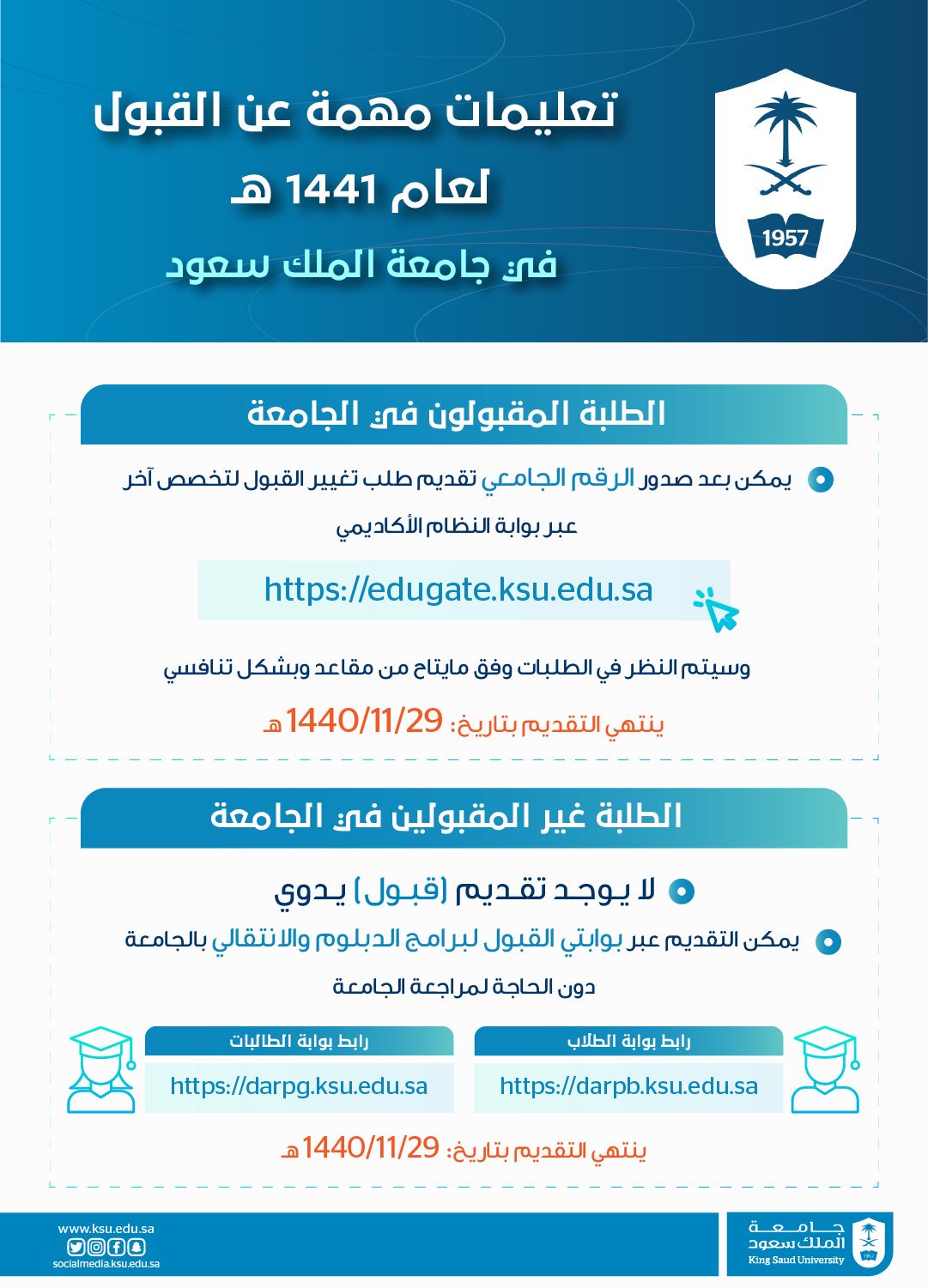 عمادة القبول والتسجيل On Twitter تعليمات مهمة لغير المقبولين في جامعة الملك سعود في بوابتي القبول الإلكتروني الموحد للطلاب والطالبات للعام الجامعي 1442هـ مع خالص الدعوات لهم بالتوفيق Https T Co Eehcin4iep Https T Co Xs3dil4rnm
