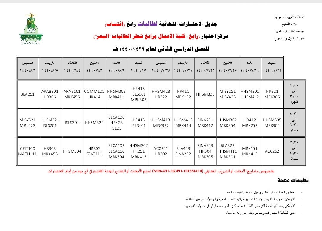 عمادة القبول والتسجيل Kau No Twitter جداول الاختبارات النهائية لكلية الأعمال برابغ مركز جده مركز رابغ المناطق طالبات انتساب جامعة الملك عبدالعزيز Https T Co Tft3leozrj