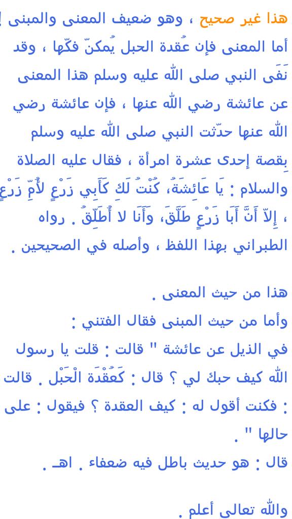 الأحاديث الضعيفة والباطلة صحح معلوماتك الحديثية متن الحديث المكذوب عن عائشة رضي الله تعالى عنها قالت قلت يا رسول الله كيف حبك لي قال كعقدة الحبل فكنت أقول كيف العقدة يا