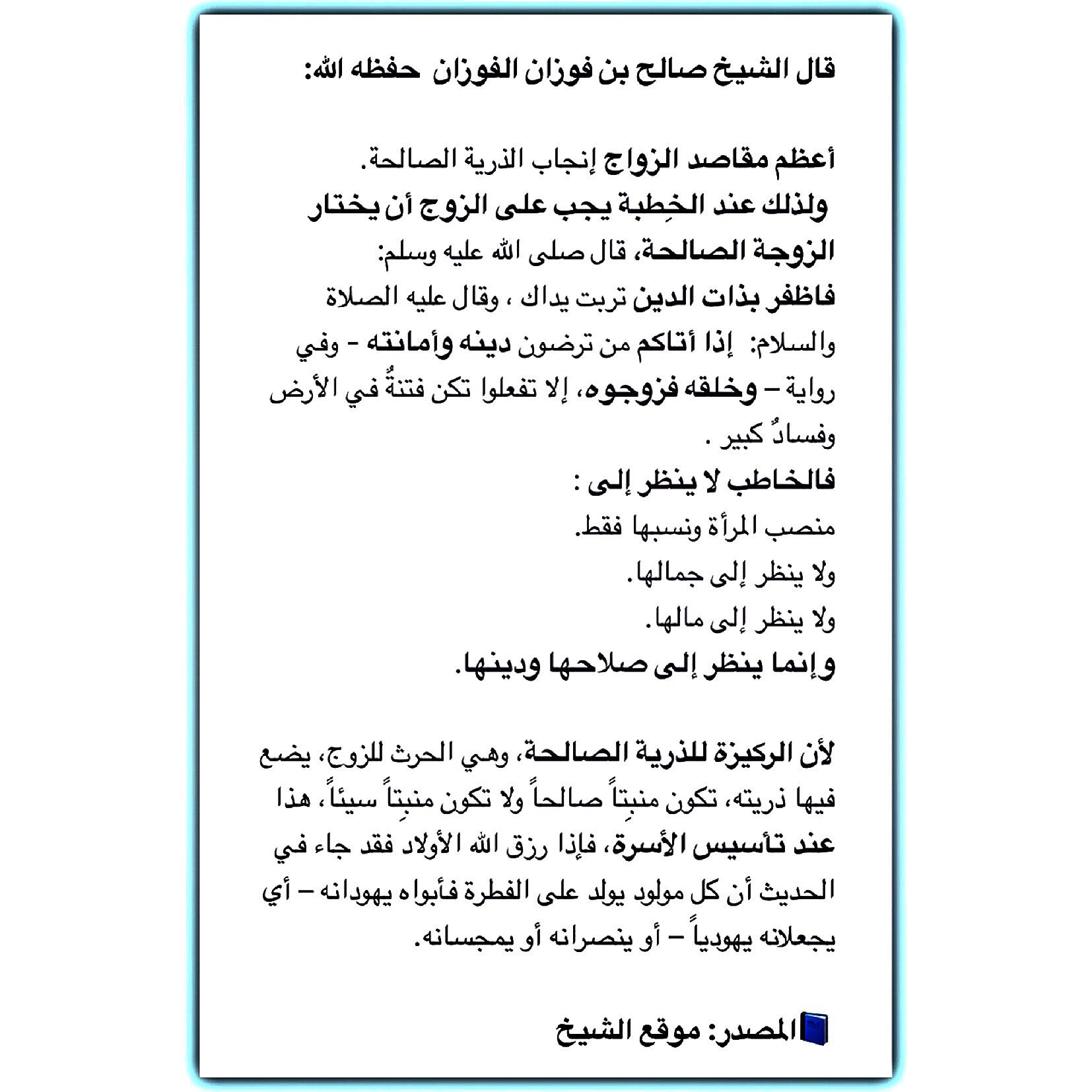 O Xrhsths العلامة صالح الفوزان Sto Twitter قال الشيخ صالح بن فوزان الفوزان حفظه الله أعظم مقاصد الزواج إنجاب الذرية الصالحة ولذلك عند الخ طبة يجب على الزوج أن يختار الزوجة الصالحة قال